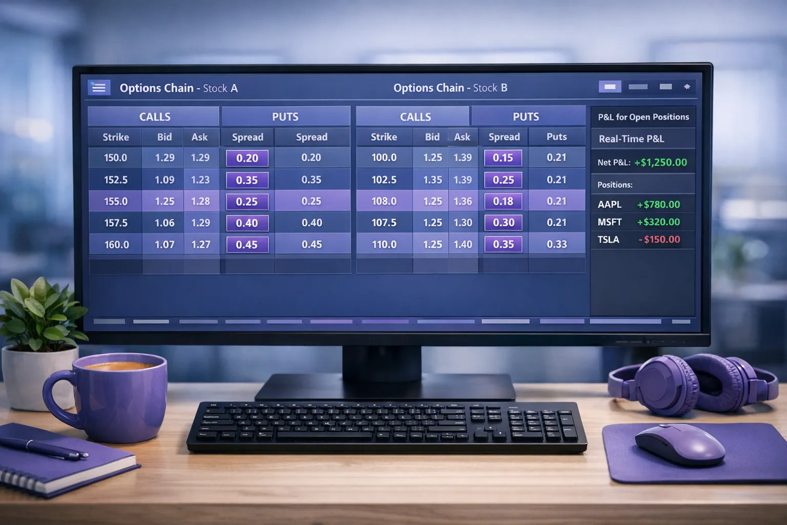 - Real-time options P&L tracking: Stay aware of position performance while markets move.
